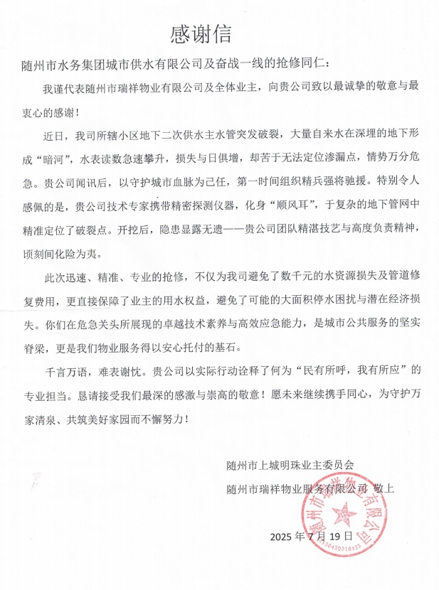 7月19日,上城明珠小區(qū)業(yè)委會與瑞祥物業(yè)的代表滿懷感激,將一面繡有“排憂解難、水域神探” 的錦旗和一封情真意切的感謝信送到城市供水公司,以此表達全體業(yè)主對城市供水公司的誠摯謝意。“若不是有你們團隊的精湛技藝與高度負責(zé)精神,我們的損失不堪設(shè)想!這面錦旗雖輕,卻裝著全體業(yè)主的滿心感激!” 代表們緊握工作人員的手,話語間滿是動容。