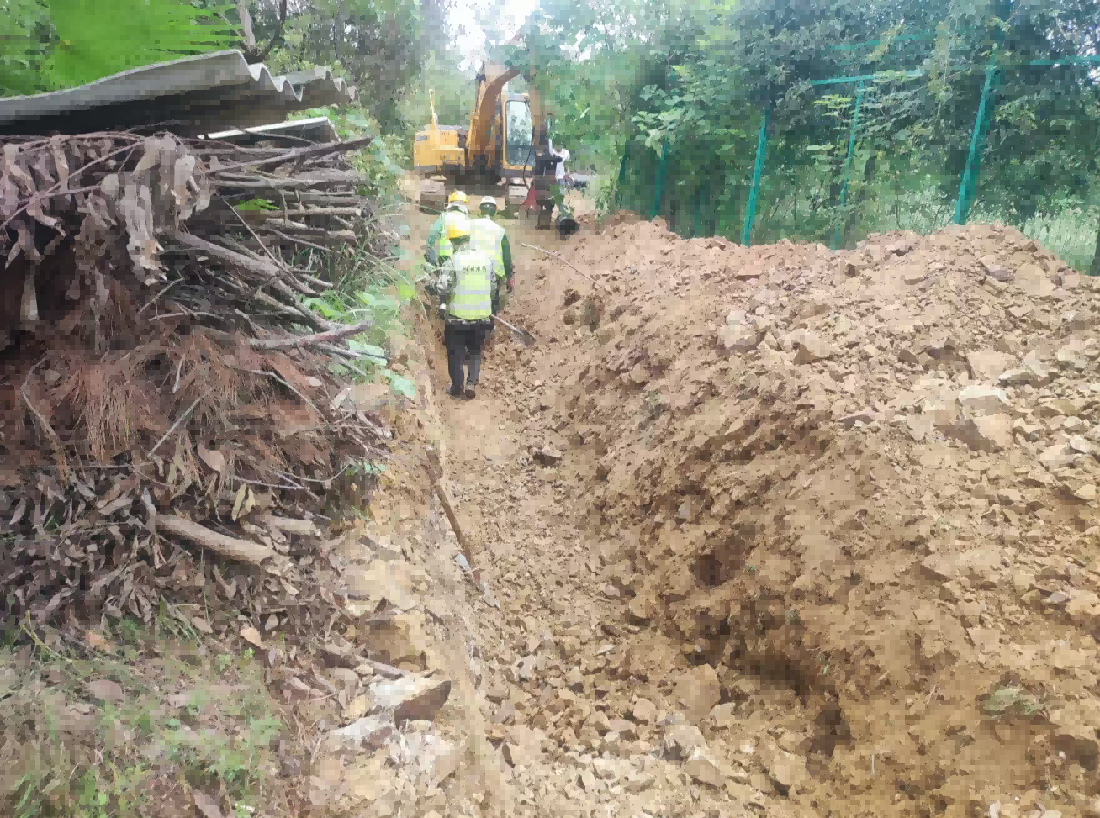 機(jī)電學(xué)校DN250球墨管供水工程線路處于山地丘陵地帶,沿線涉及鄉(xiāng)村道路、開墾菜園、陡峭山體等多重地質(zhì)和復(fù)雜環(huán)境考驗(yàn)。在沿機(jī)電學(xué)校圍墻邊緣鋪設(shè)段,鄉(xiāng)村道路與圍墻之間不足3米的狹窄空間,成為施工線路上的“攔路虎”,該道路是周邊居民日常出行的主要通道,一旦長時(shí)間阻斷,將嚴(yán)重影響群眾生活。項(xiàng)目部與學(xué)校和村委共同研討下,最終確定利用2天時(shí)間,集中突擊,調(diào)用多臺設(shè)備,全力沖刺,快速施工完成后復(fù)路于民,順利啃下硬骨頭。